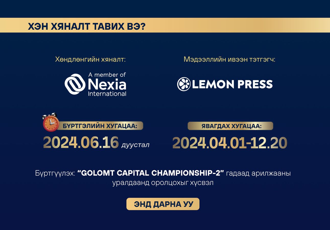 Эрхэм та Голомт Капитал ҮЦК-ийн зохион байгуулж буй “Golomt Capital Championship-2” гадаад арилжааны уралдаанд оролцож, хөрөнгийн зах зээлд хөл тавих анхны алхамаа хийн, мэргэшсэн менторуудаас зөвлөгөө, мэдээлэл аваарай.
