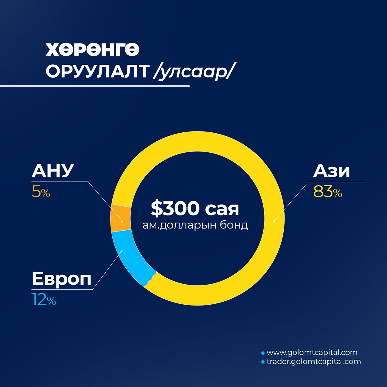 Бондыг АНУ, Ази, Европ болон Монгол Улсын мэргэжлийн хөрөнгө оруулагчид худалдан авснаас Азийн хөрөнгө оруулагчид 83%, Европ 12%, АНУ 5%-ийг бүрдүүлсэн байна.