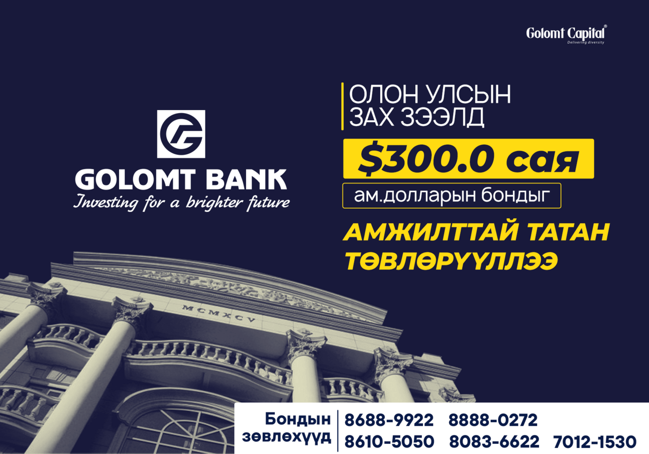ГОЛОМТ БАНК ОЛОН УЛСЫН ЗАХ ЗЭЭЛД 300.0 САЯ АМ.ДОЛЛАРЫН БОНДЫГ АМЖИЛТТАЙ ГАРГАЛАА