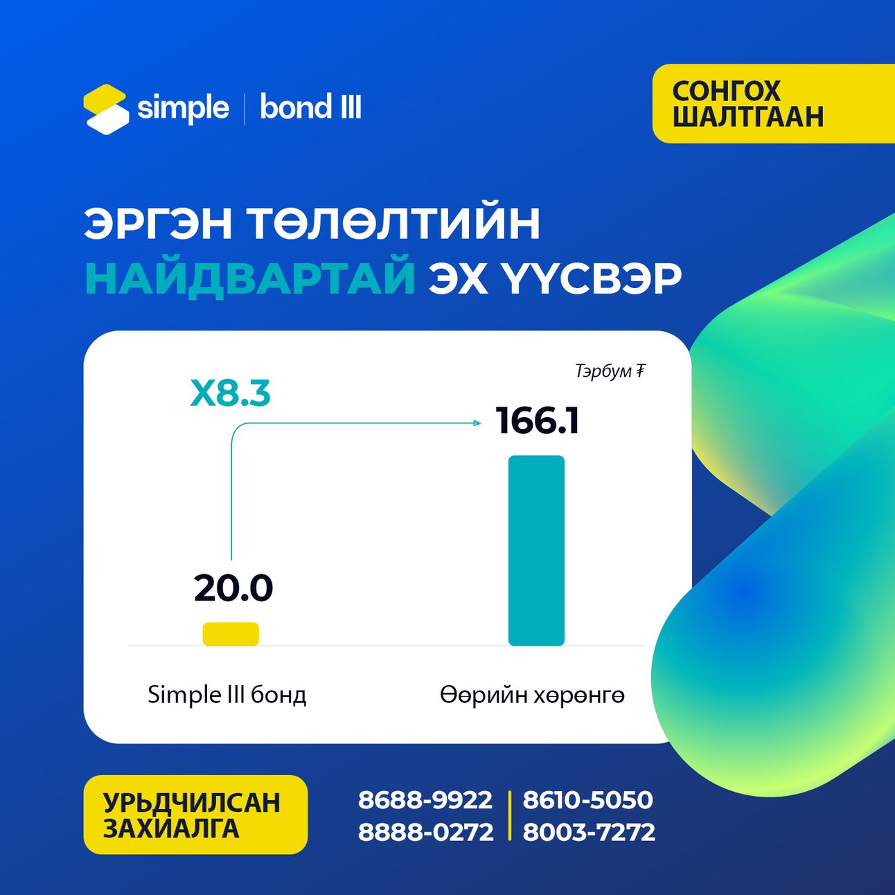 Тэгвэл тус компанийн Simple III бонд нь 20.0 тэрбум төгрөгийг татан төвлөрүүлэх бөгөөд өөрийн хөрөнгөөс 8.3 дахин бага буюу ердөө 12 хувьтай нь тэнцэж байна.