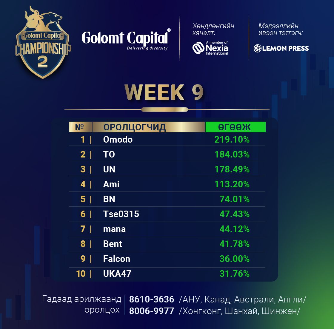 Golomt Capital Championship-2 уралдааны ТОП-10 оролцогчийн дундаж өгөөж 9 дэх дэх долоо хоногт хуримтлагдсан дүнгээр 96.99%-тай байна.