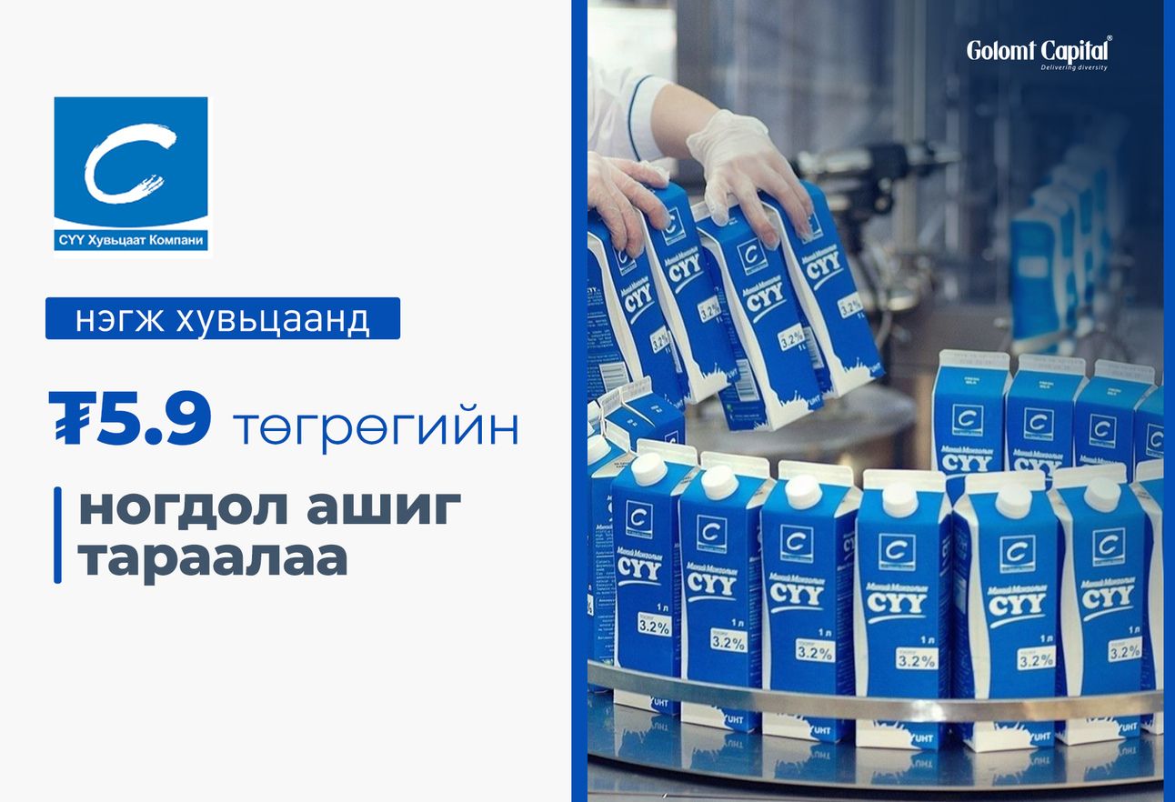 Сүү ХК-ийн ТУЗ-ийн 2024.02.15-ны өдрийн 04 тоот тогтоолын дагуу компанийн 2023 оны сүүлийн хагас жилийн цэвэр ашгаас💵2,024,479,726 төгрөгийг нийт хувьцаа эзэмшигчдэдээ, нэгж хувьцаанд💵5.9 төгрөгөөр тооцож ногдол ашиг тараалаа.