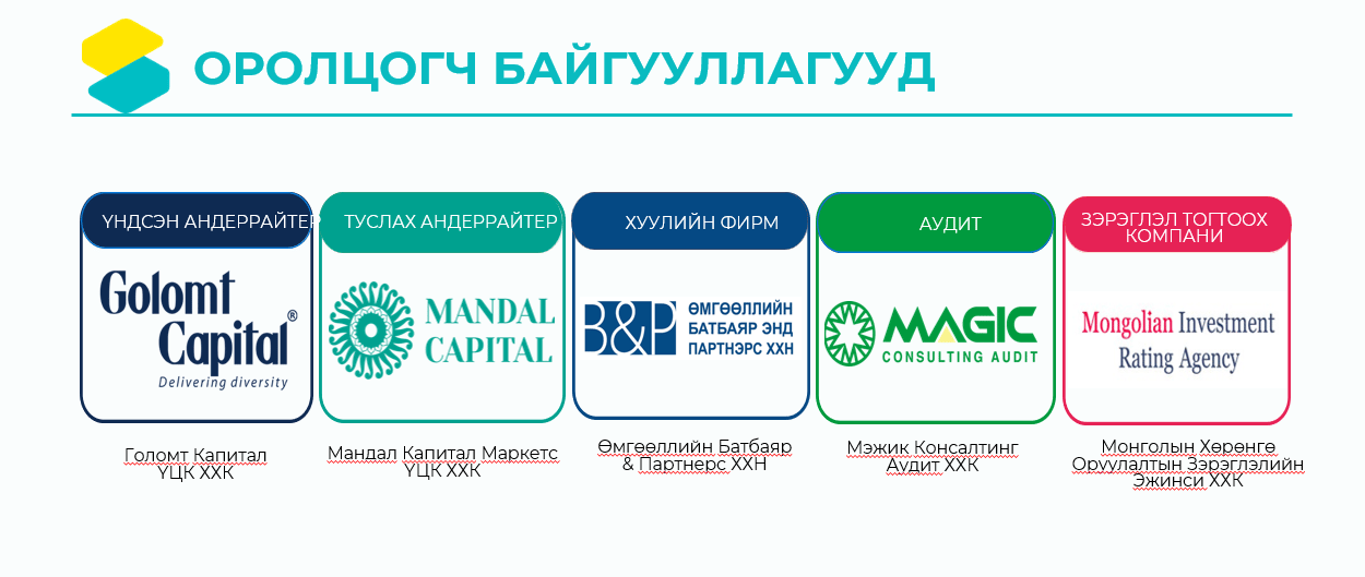 Хөндлөнгийн хууль, аудит, андеррайтерийн компаниуд болон зохицуулагч байгууллагууд болох СЗХ, МХБ-ийн шалгуурыг хангасан.
